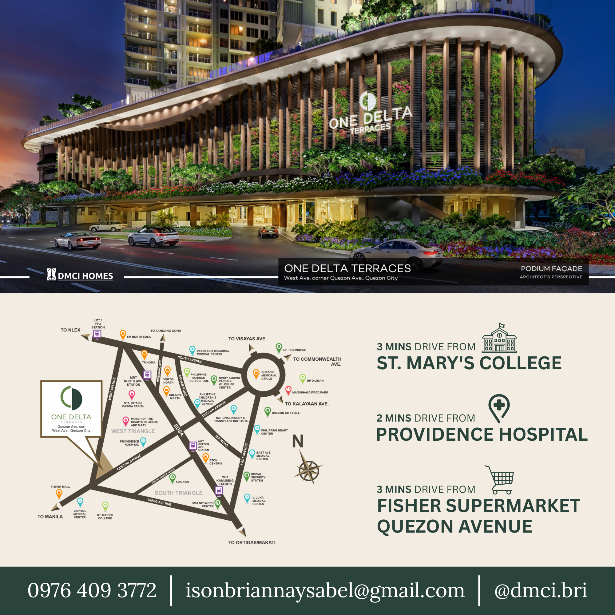 One Delta Terraces by DMCI Homes is a modern high-rise residential development located at the corner of West Avenue and Quezon Avenue, Quezon City. Designed with a contemporary architectural theme, it offers thoughtfully planned studio, 2-bedroom, and 3-bedroom units complemented by premium amenities and generous open spaces. With its strategic location and resort-inspired living, One Delta Terraces is ideal for those seeking comfort, convenience, and urban accessibility.
